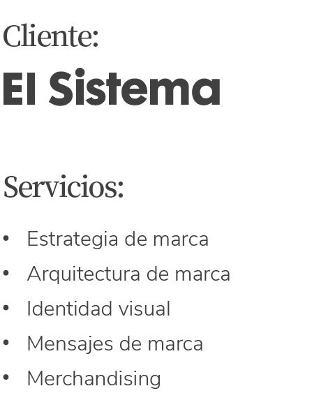 Tras más de 40 años de existencia y éxitos en el mundo, El Sistema Nacional de Orquestas y Coros Juveniles e Infantiles de Venezuela, hoy simplemente El Sistema, quería renovarse. Su solicitud fue clara: “queremos una marca que represente lo que somos actualmente”. Así fue como el equipo desplegó un plan ambicioso para desarrollar una estrategia de marca poderosa que comunicara el ADN del proyecto musical, y se concentró en hacer una investigación y reorganización interna para crear: